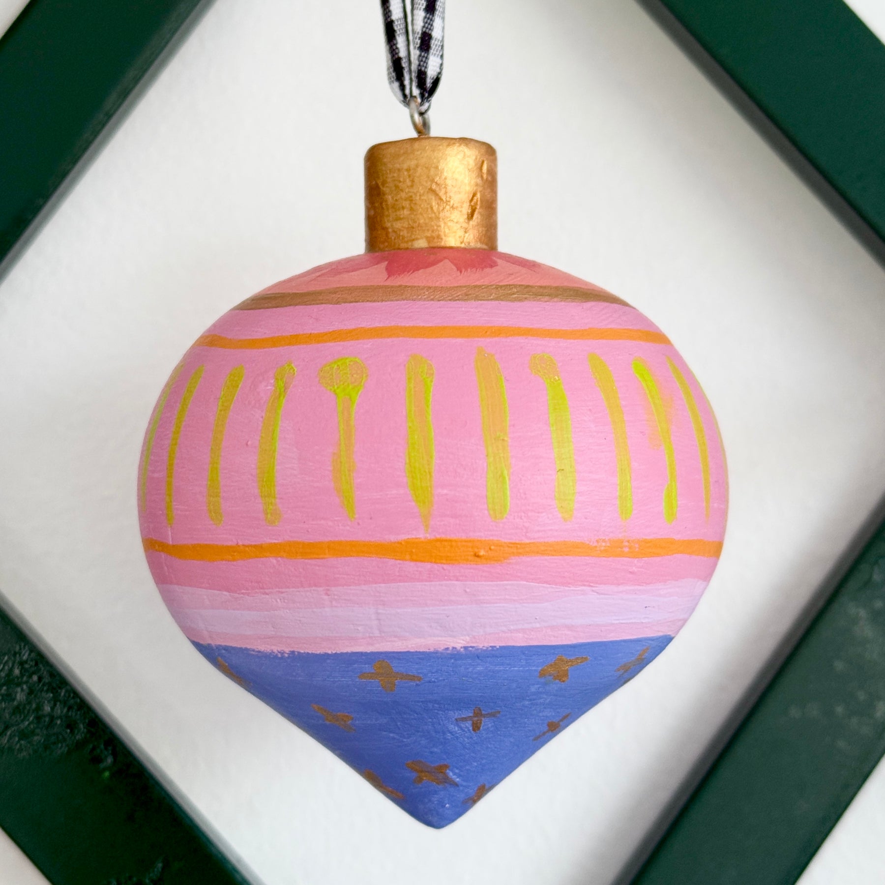 any of these colorful ornaments would make a festive and untraditional addition to your holidazzle decor. hand-painted in colorful patterns and stripes, each ornament measures approximately 3.5" in height x 3" wide and comes strung on a gingham ribbon.