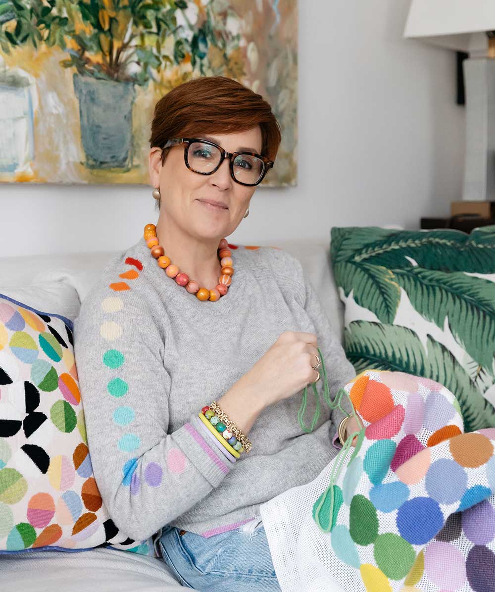 Elizabeth creates colorful, hand-painted statement jewelry and designs graphic and unconventional needlepoint canvases in her studio in Rhode Island.